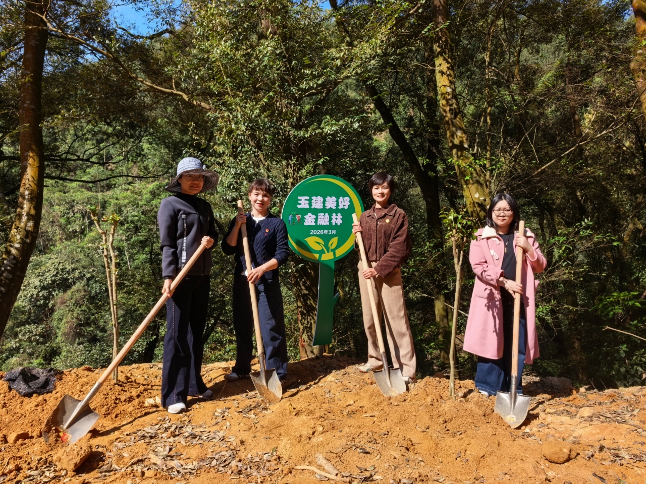 (图为四位伙伴在“玉建美好金融林”处合影)