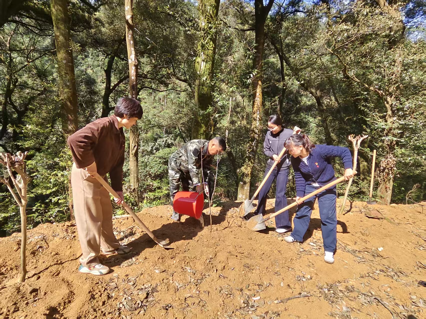 (图为三位伙伴与林场工作人员协力种植)