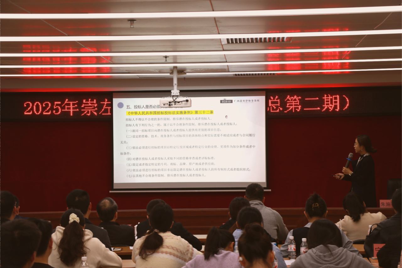 2025年11月26日,受崇左市人民政府国有资产监督管理委员会邀请,本所三级计点合伙人朱施蓓律师在市工投集团职工会议室为全市国资系统开展专题法律培训,围绕"国有企业采购流程与采购合同法律风险防范"主题进行专业分享,取得圆满成功。