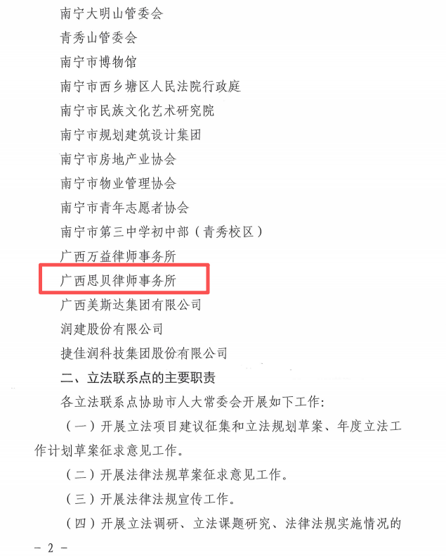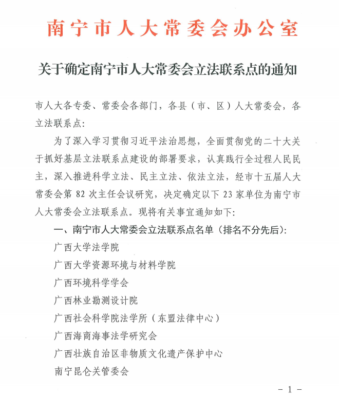近日,经南宁市十五届人大常委会第82次主任会议研究,南宁市人大常委会确定本所为立法联系点。