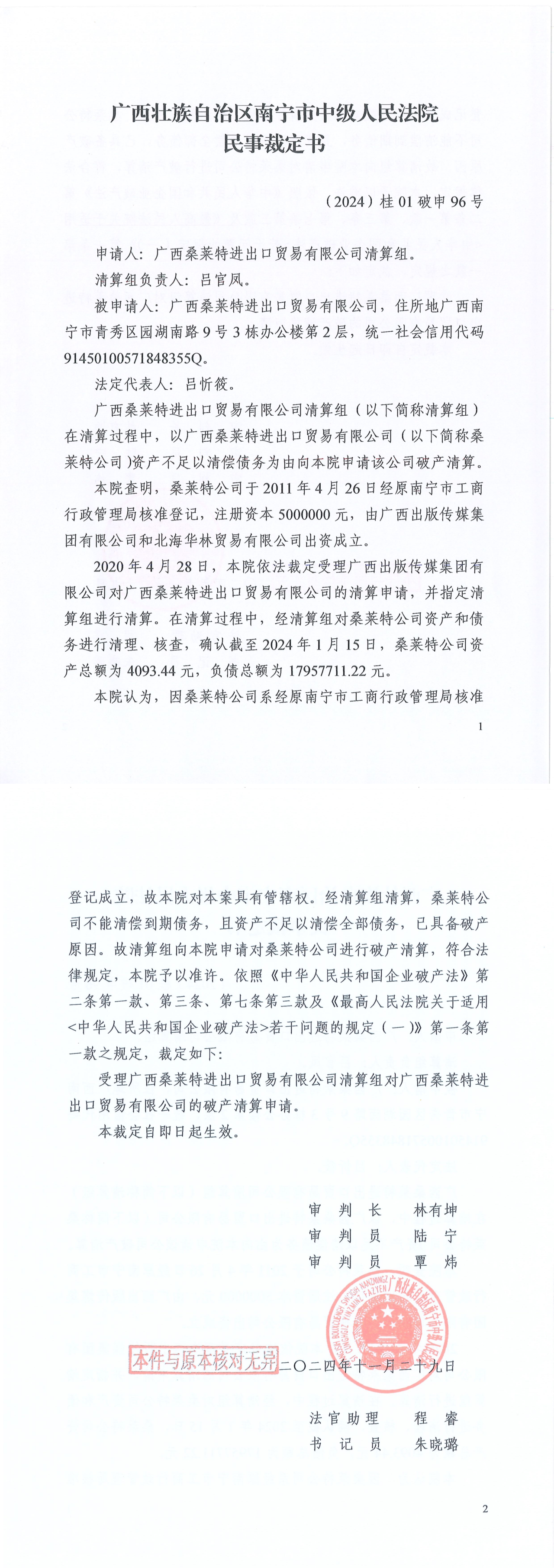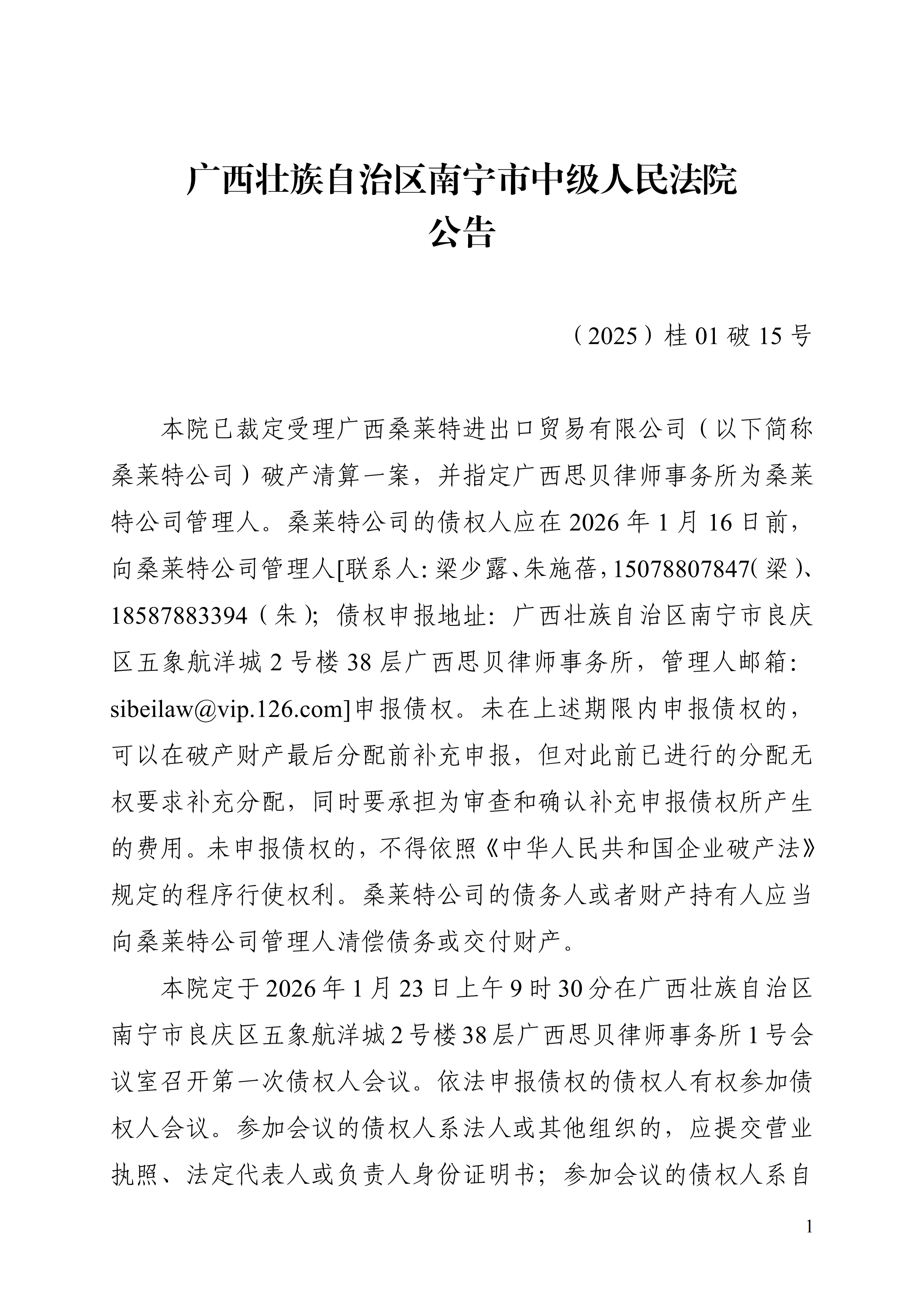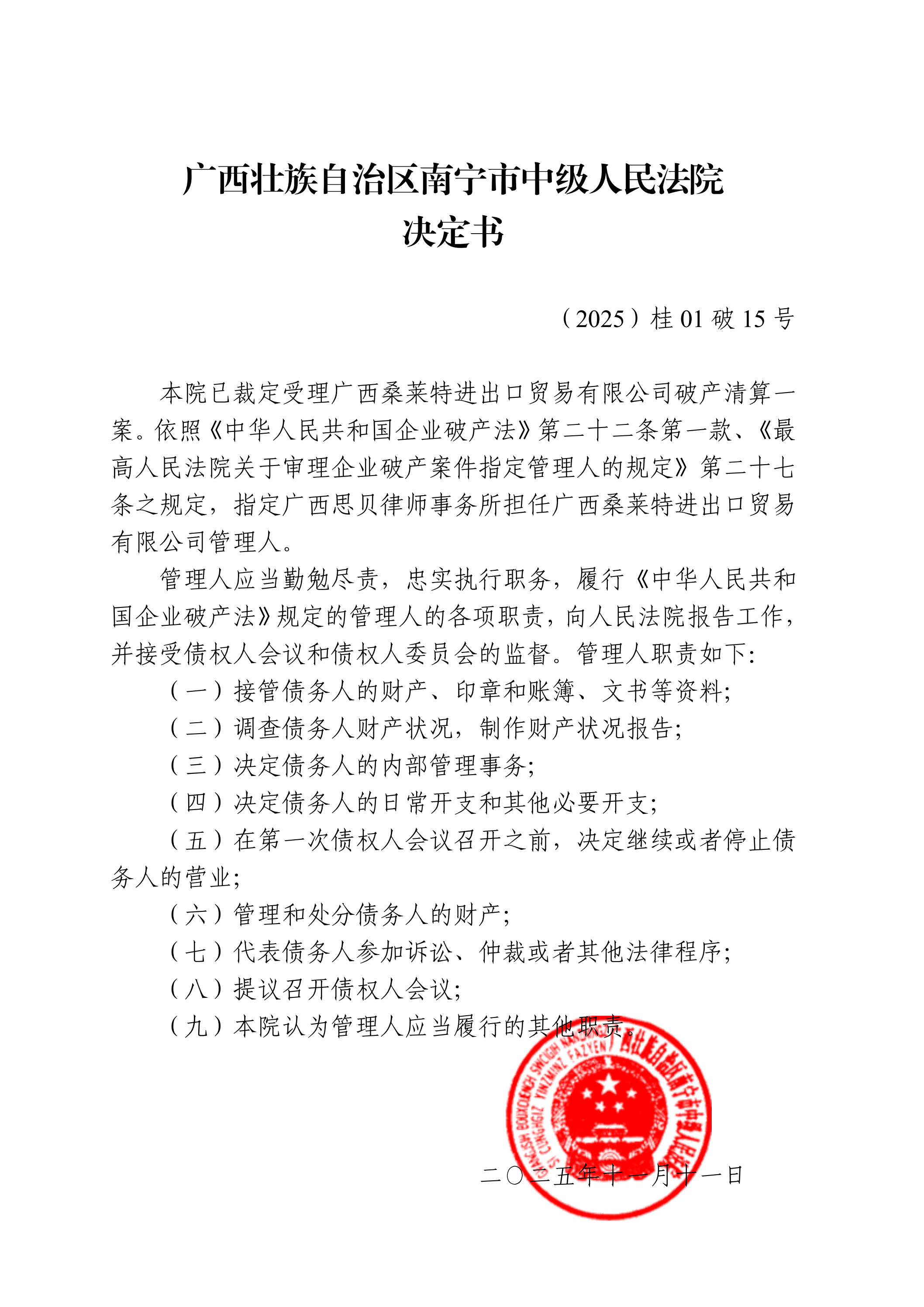 2024年12月29日,南宁市中级人民法院作出(2024)桂01破申96号民事裁定书,裁定受理广西桑莱特进出口贸易有限公司(以下简称“桑莱特公司”)破产清算一案。2025年11月11日,广西南宁市中级人民法院作出(2025)桂01破15号决定书,指定广西思贝律师事务所担任桑莱特公司管理人(以下简称“管理人”)。