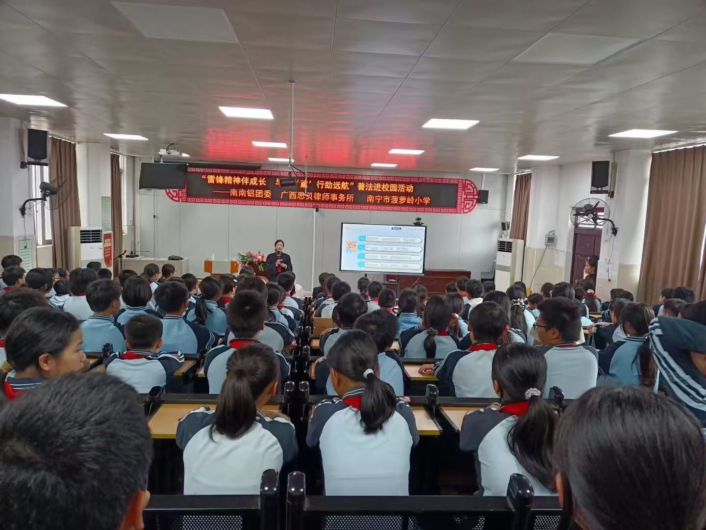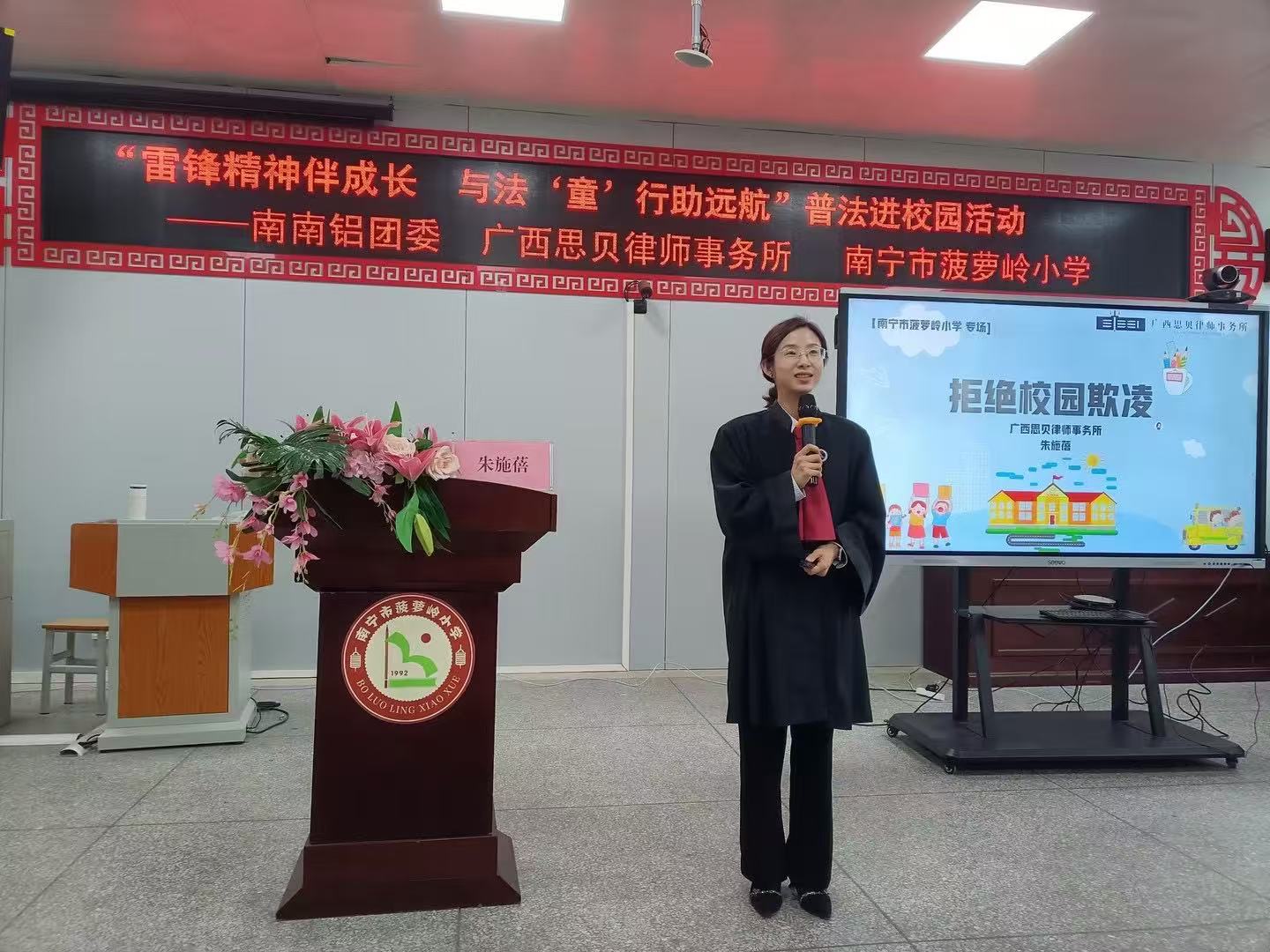 2026年3月19日下午,本所二级计点合伙人朱施蓓律师受邀参加菠萝岭小学与南南铝团委联合主办的“雷锋精神伴成长,与法童行助远航”普法进校园活动,为同学们带来一场拒绝校园霸凌专题公益讲座。