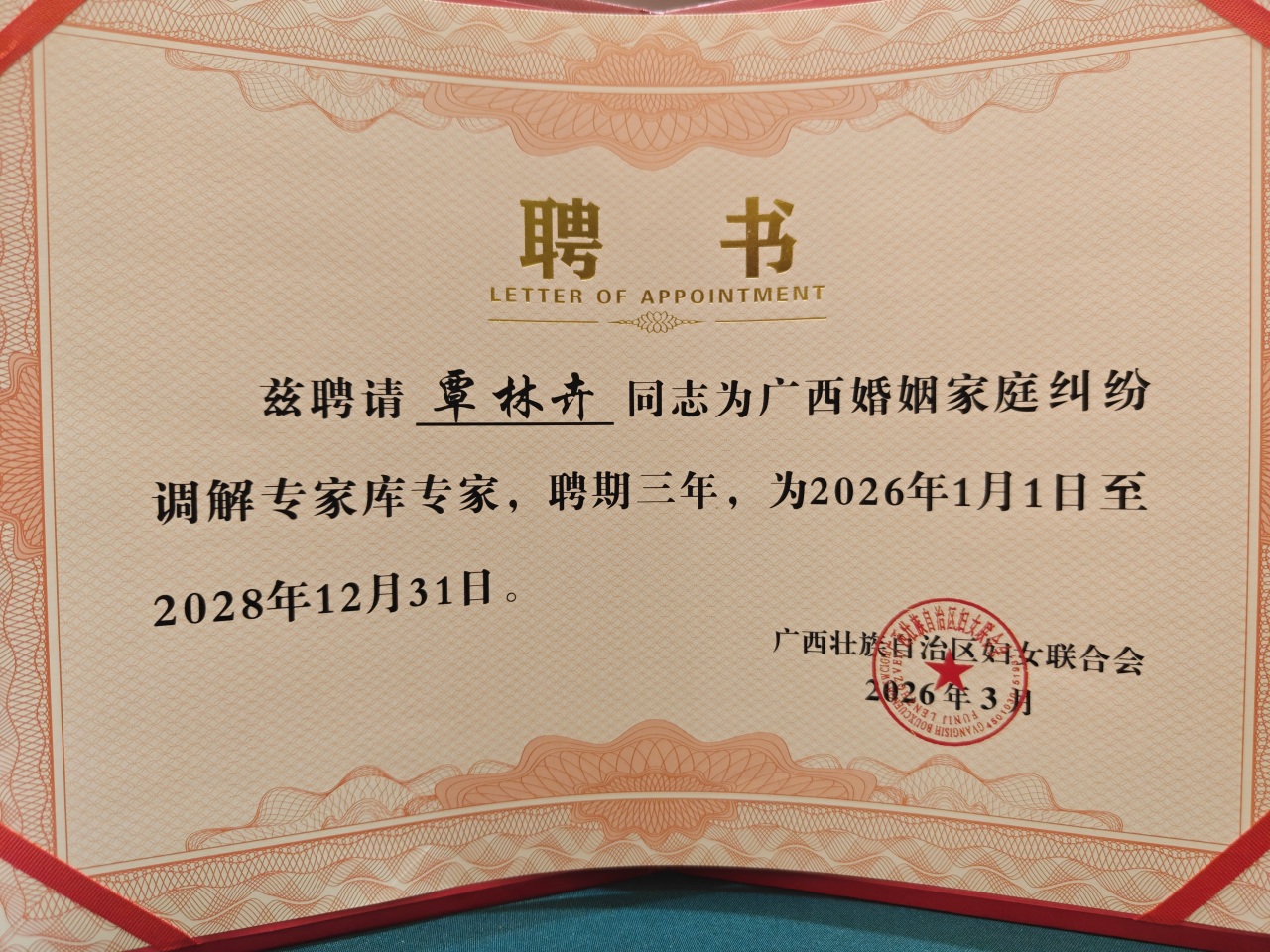 此次受聘和培训,不仅是对覃林卉律师个人专业能力的认可,也体现了本所在婚姻家庭法律服务领域的持续深耕。