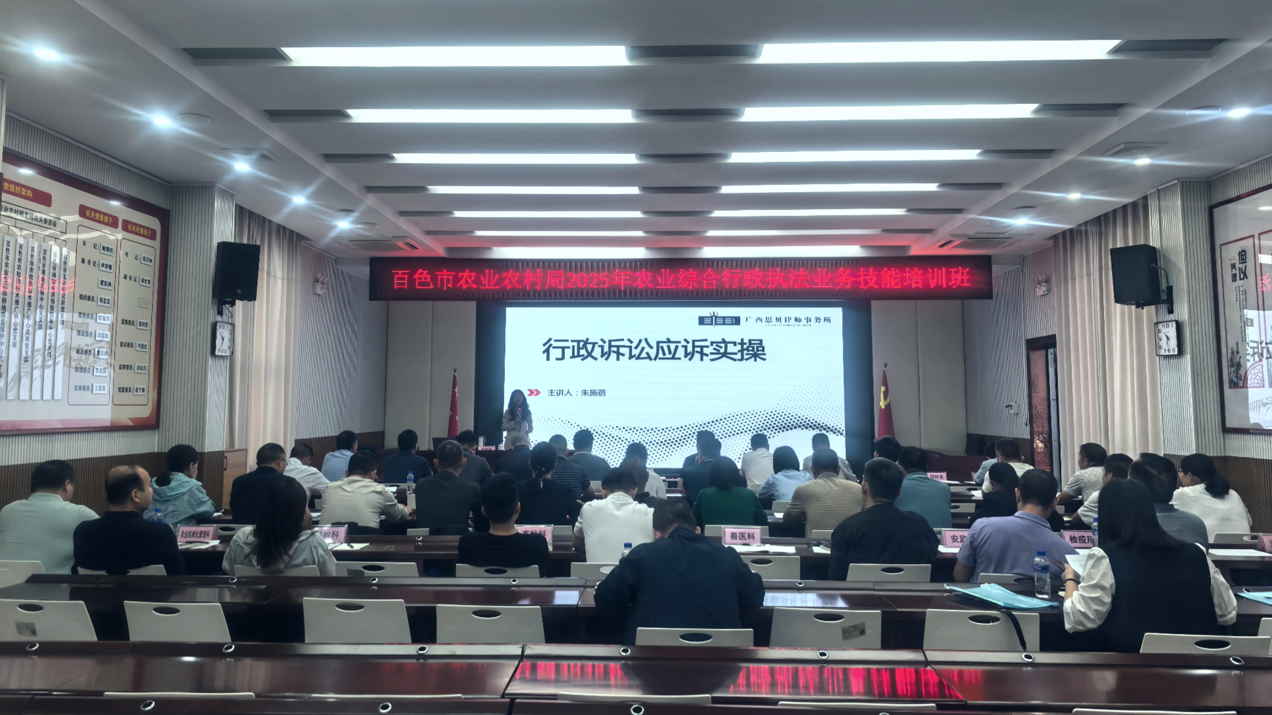 2025年5月28日上午10:30-12:00,本所计点合伙人朱施蓓为百色市农业农村局2025年农业综合行政执法业务技能培训班共计50人开展《行政诉讼应诉实操》专题培训。